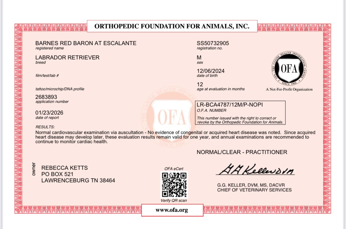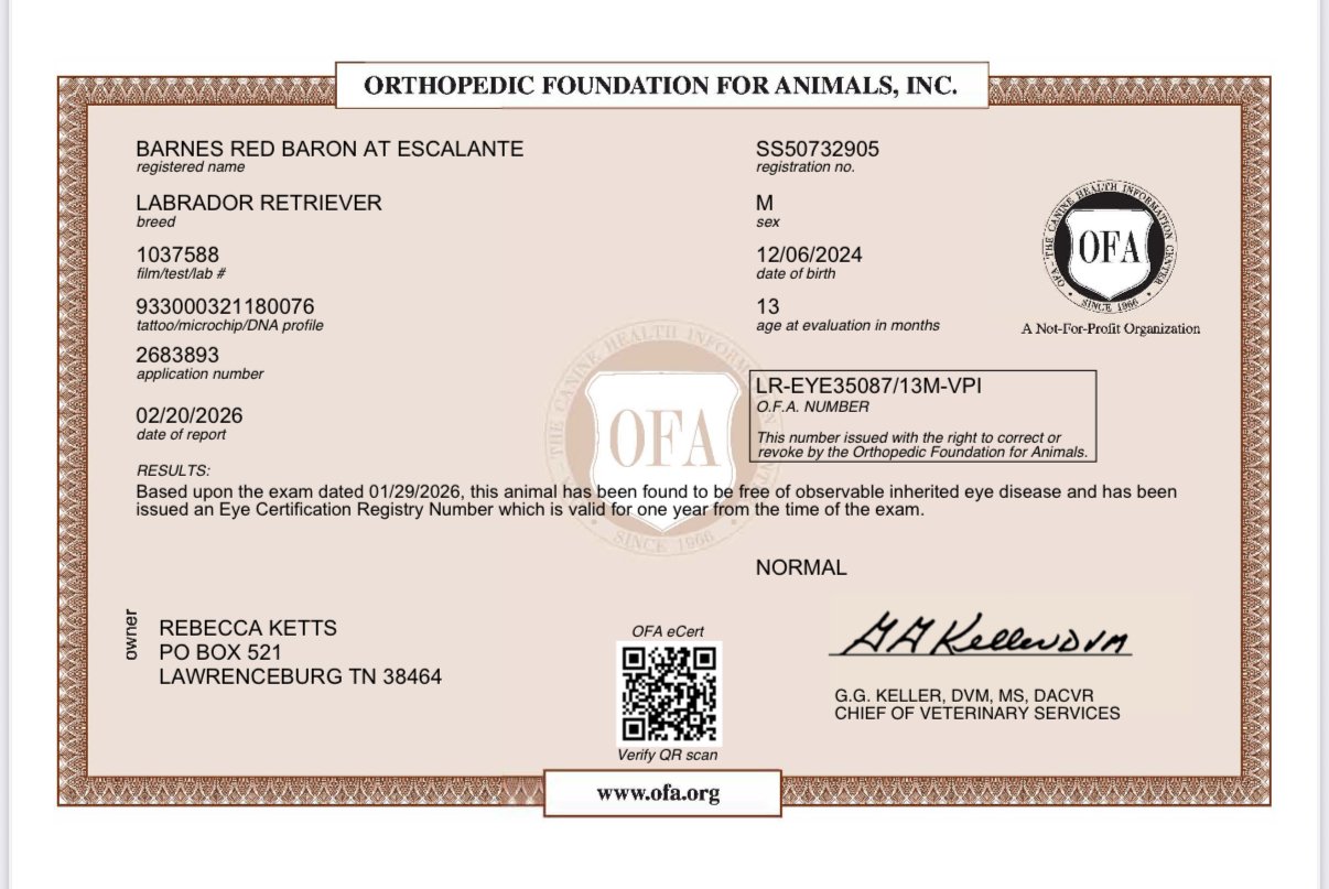 EXCELLENT Based on 32 reviews Posted on Jamie OesterlingTrustindex verifies that the original source of the review is Google. We got a red lab puppy from Rebecca in June of 2022 and she’s easily one of the best labs I’ve ever owned. (Tilly) fit into our lifestyle perfectly with going on the boat and also just wanting to be outside/going on walks. We now have an (almost 18 month old daughter) and Tilly is so patient with her. We honestly couldn’t have asked for a better family dog.Posted on Kyle StetsonTrustindex verifies that the original source of the review is Google. Everything from start to finish was first class. Rebecca was very communicative throughout the whole process and always responded in a timely manner. I am in Austin, TX and she helped arrange transportation which is very painless for anyone not able to pick up their puppy themselves. The puppies come as advertised and are very well mannered, smart dogs. Couldn’t recommend more!Posted on Kelly FloydTrustindex verifies that the original source of the review is Google. Escalante Kennels is phenomenal! Rebecca was extremely knowledgeable, kept us updated through the entire process, sent us pictures of the pups, and truly cares about their health and making sure they go to a great home! We can’t thank her enough for our big healthy boy! He’s so smart and already learning how to be a well-behaved dog. Crockett is quickly adapting to the Florida lifestyle !Posted on owen SchoonoverTrustindex verifies that the original source of the review is Google. From Lima Ohio. Shopping with Escalante kennels was a very quick and easy transaction that they kept me updated on through the whole breeding and litter processes.Posted on Elizabeth McPhersonTrustindex verifies that the original source of the review is Google. We picked up our new puppy from Escalante Kennels on December 19, 2024. We were concerned about how our current Lab would react with a new puppy in the house and we talked with Becca about this before putting down a deposit. Instead of brushing off our concerns, she asked questions about our current dog and his behavior with other dogs. She helped us understand that while it might be difficult for our current dog at first, he had never demonstrated behavior that would be threatening to a new puppy. This helped relieve our minds and made us feel that Escalante Kennels was the right choice for us. Becca was great with communicating with us from the time we put a deposit down until the time we picked up our new puppy. Our new puppy is so calm, so willing to learn (and he learns so quickly!), and so snuggly, and we couldn’t be happier with him. It did take a couple of weeks for our older dog to warm up to the puppy, but now they are inseparable and play together all the time. We live just southeast of Knoxville, TN, and while there are breeders who are much closer to us, we feel that we made the right choice in driving 4 hours to get our new puppy from Escalante Kennels and wouldn’t hesitate at all to get another puppy from Becca in the future.Posted on Sara DavisTrustindex verifies that the original source of the review is Google. We are in love! Our fox red English Lab pup is not only gorgeous, but incredibly smart, and the sweetest little thing!! He was crate trained the first night, and already answers to simple commands. We are thrilled with our little Rocky! Highly recommend Escalante Kennels! Rebecca sends lots of pictures and updates, as they grow. Super healthy, happy pups. ❤️Posted on Roger MerrymanTrustindex verifies that the original source of the review is Google. We just got a puppy from Escalante and he is the absolute best. We are from Lafayette Indiana and even though there was a few 100 miles between us the experience was superb.Posted on R PTrustindex verifies that the original source of the review is Google. We are so grateful for Rebecca and Escalante Kennels for bringing Sid into my family’s life. He’s been with us a little over a month and to say that we are in love is an understatement. He’s got the best personality- smart, goofy, and the labbiest lab that ever labbed. (IYKYK) Rebecca was super informative and communicative from the initial agreement to purchase a puppy to pick up. The vet has mentioned numerous times on how well Sid was cared for prior to coming home. When we are ready for another friend to join our family we will absolutely reach out to Escalante again.Posted on Claudia DossTrustindex verifies that the original source of the review is Google. We adopted a 4 year old retired female from Escalante kennels. She is the best and most perfect sweetest girl. We could not love her more and she fits in with our family so well! She is a beautiful yellow English lab and we receive constant compliments on her looks! She was already trained so well and behaves so well indoors. Rebecca was a joy to work with and always promptly answered all of our questions leading up to her adoption. I highly recommend Escalante Kennels if you’re looking for a Labrador puppy or older dog!Posted on Maegan TribbleTrustindex verifies that the original source of the review is Google. This breeder is the best if you want gorgeous, well-tempered English labs! Our dog was well socialized from the beginning and came home to us with a solid foundation! He was a happy, calm and fun guy at 8 weeks! He is great with our kids and other dogs. He loves to nap!! Rebecca continues to be a resource to us whenever have questions! We are so happy and if we ever get another pup it will be from Escalante! Stop researching breeders—you have found the best!!Verified by TrustindexTrustindex verified badge is the Universal Symbol of Trust. Only the greatest companies can get the verified badge who has a review score above 4.5, based on customer reviews over the past 12 months. Read more