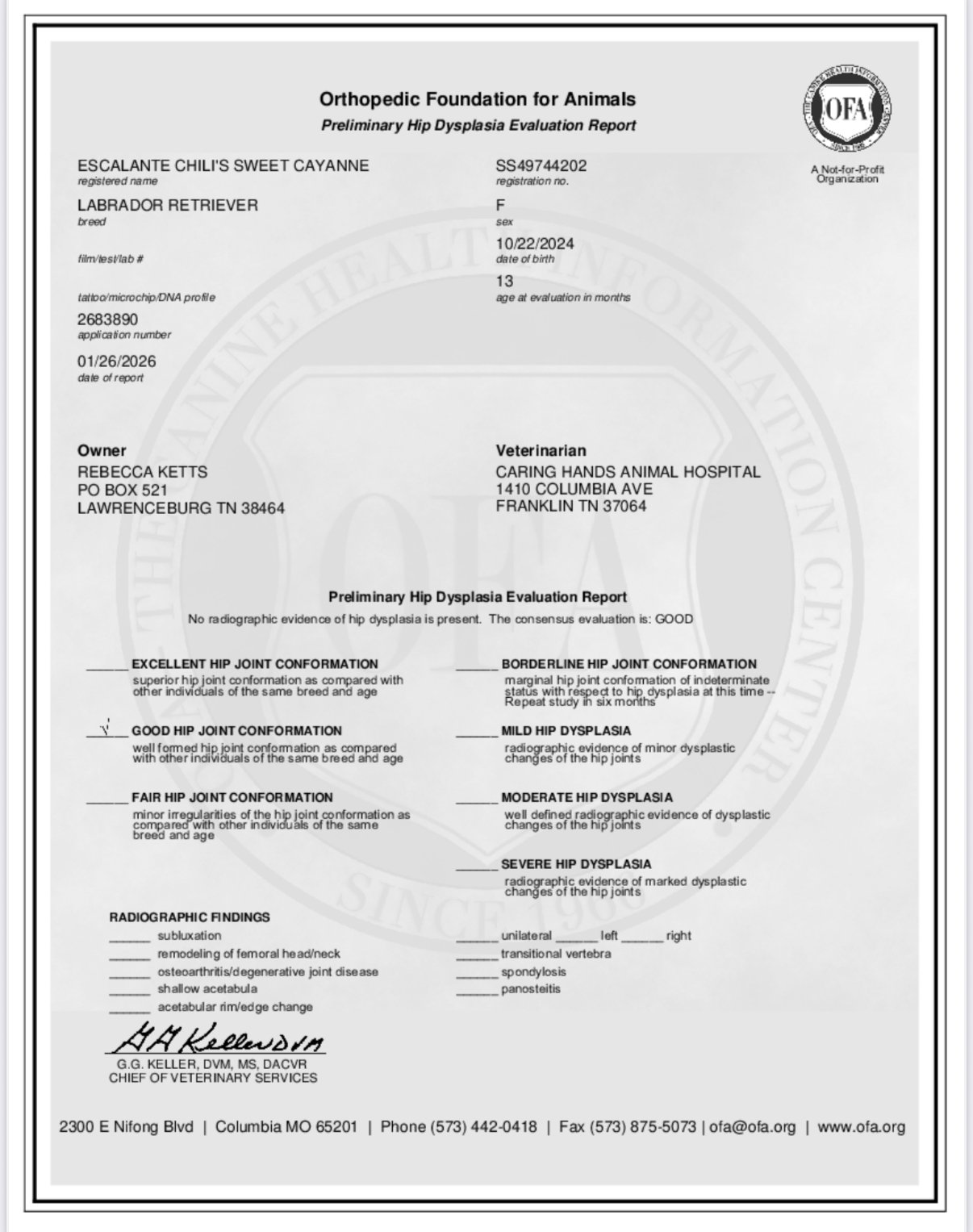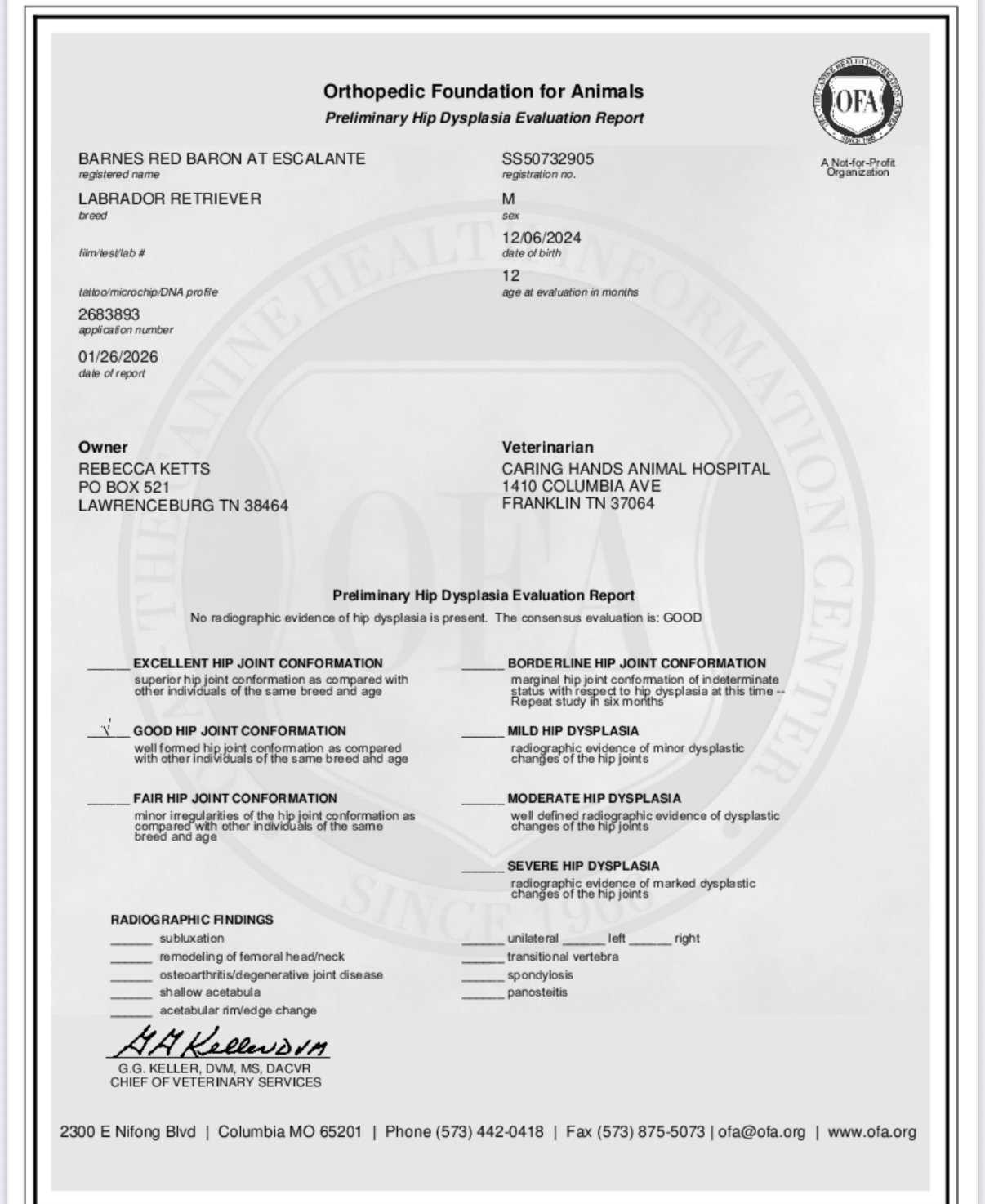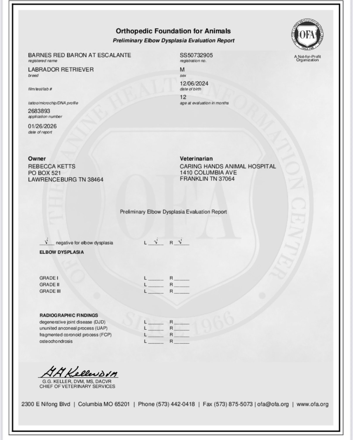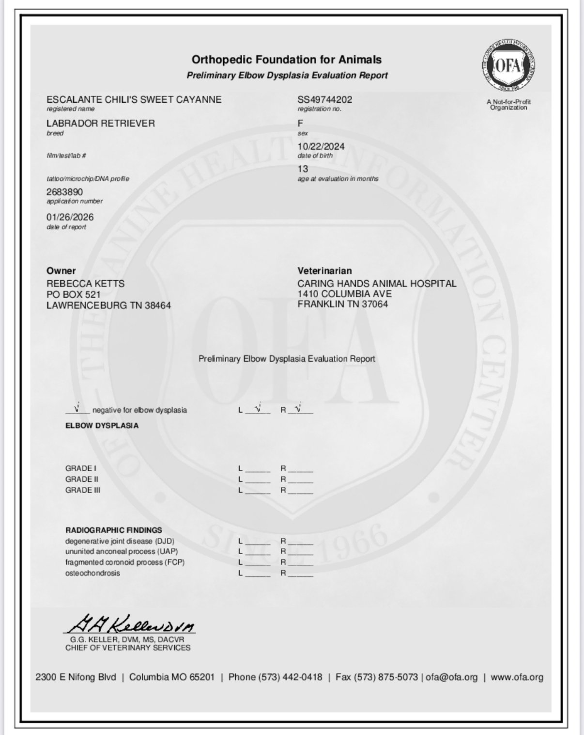OFA prelims- Hips Good. Elbows Normal, OFA Eye (CAER) Exam Normal.