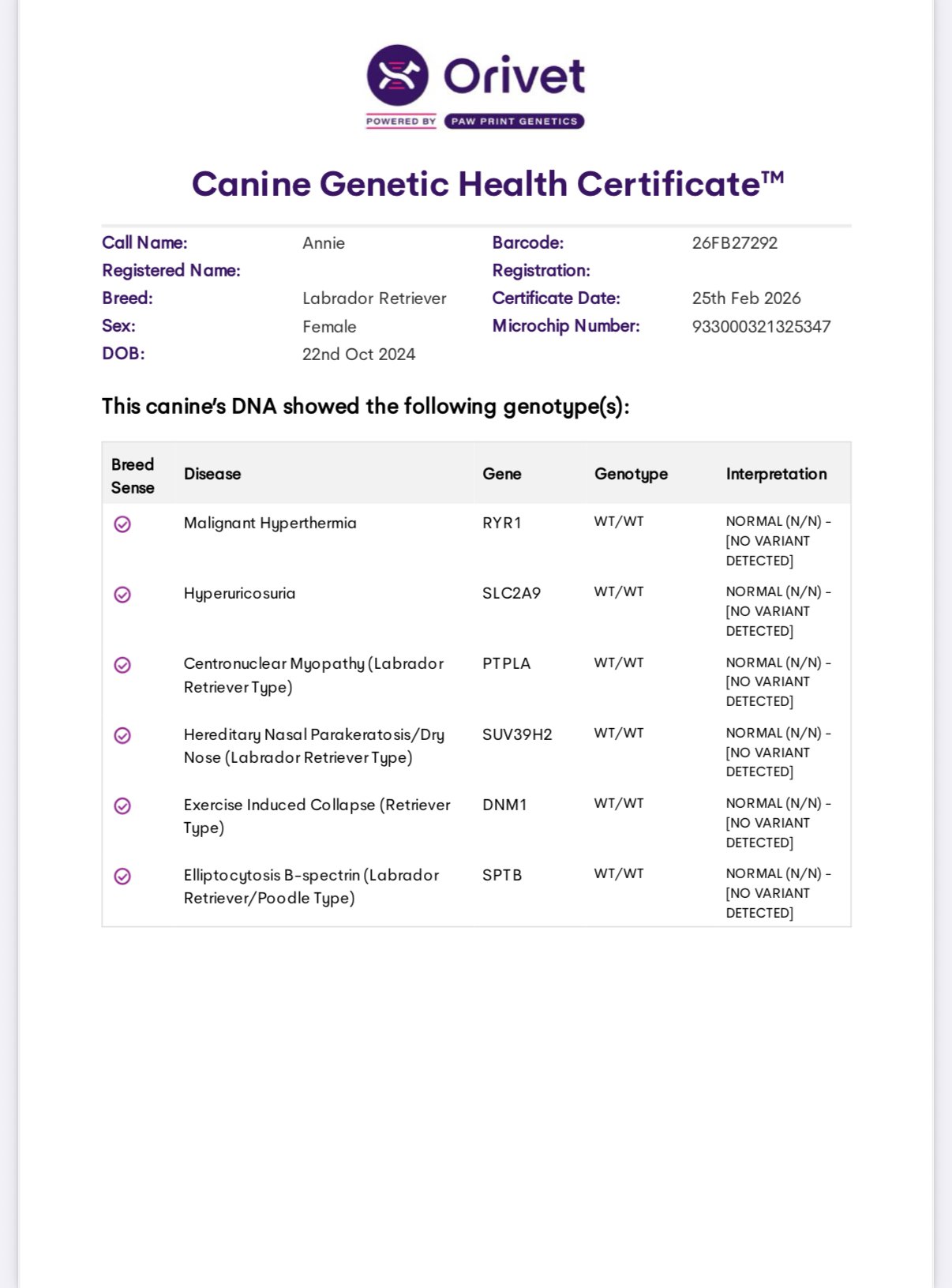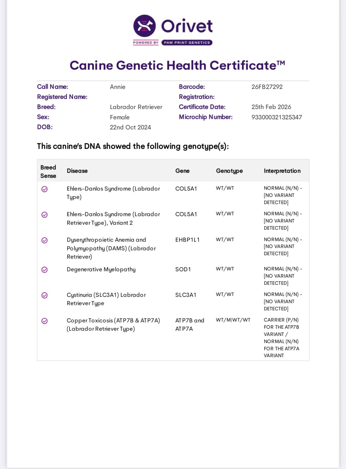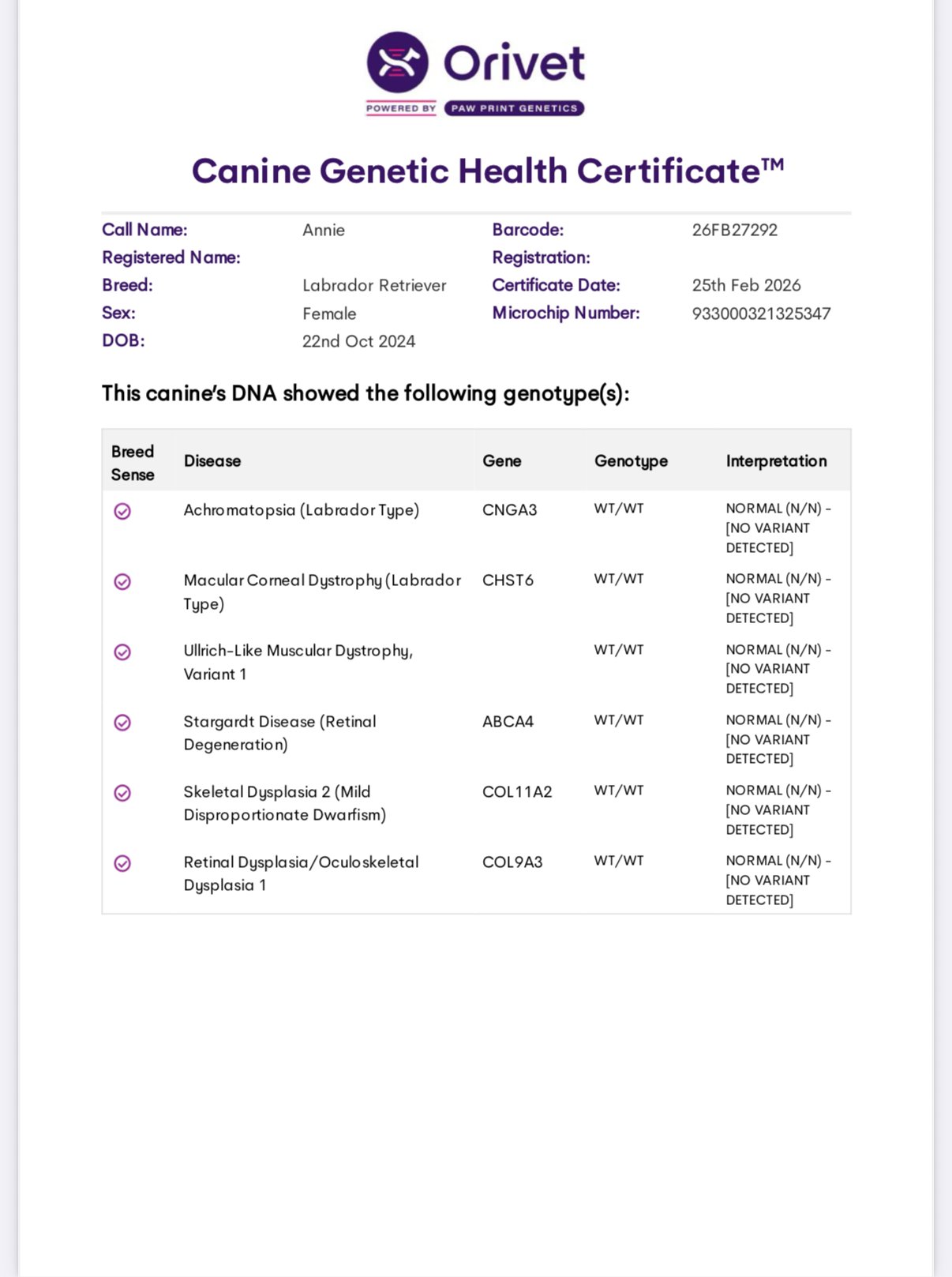 Lula is clear for PRA, CM, DM, EIC, HNPK, and Skeletal Dysplasia, and is Dilute Free. OFA Hips, Elbows Normal, OFA Eye (CAER) Exam Normal.