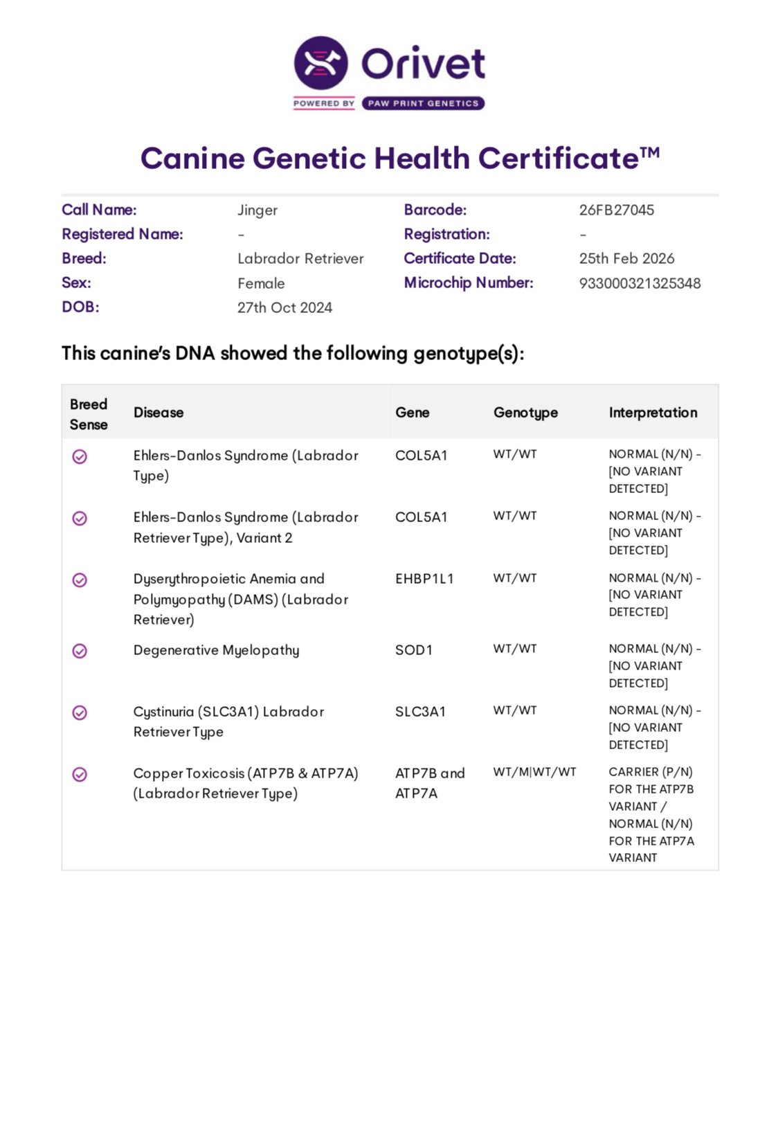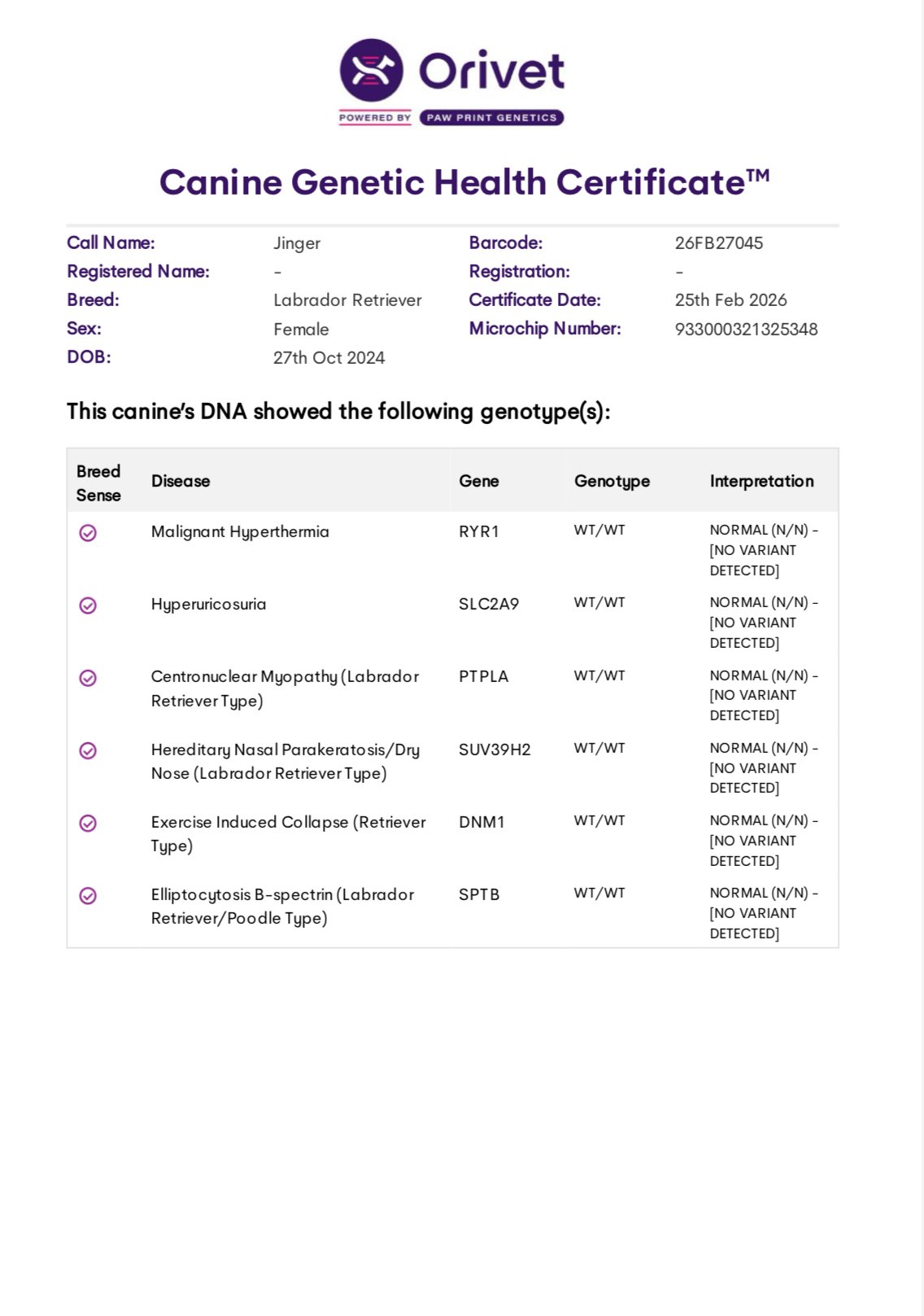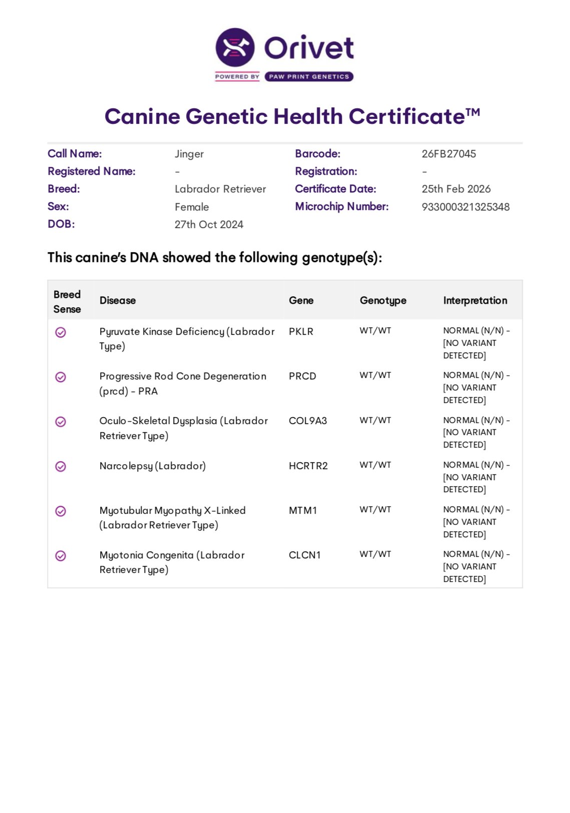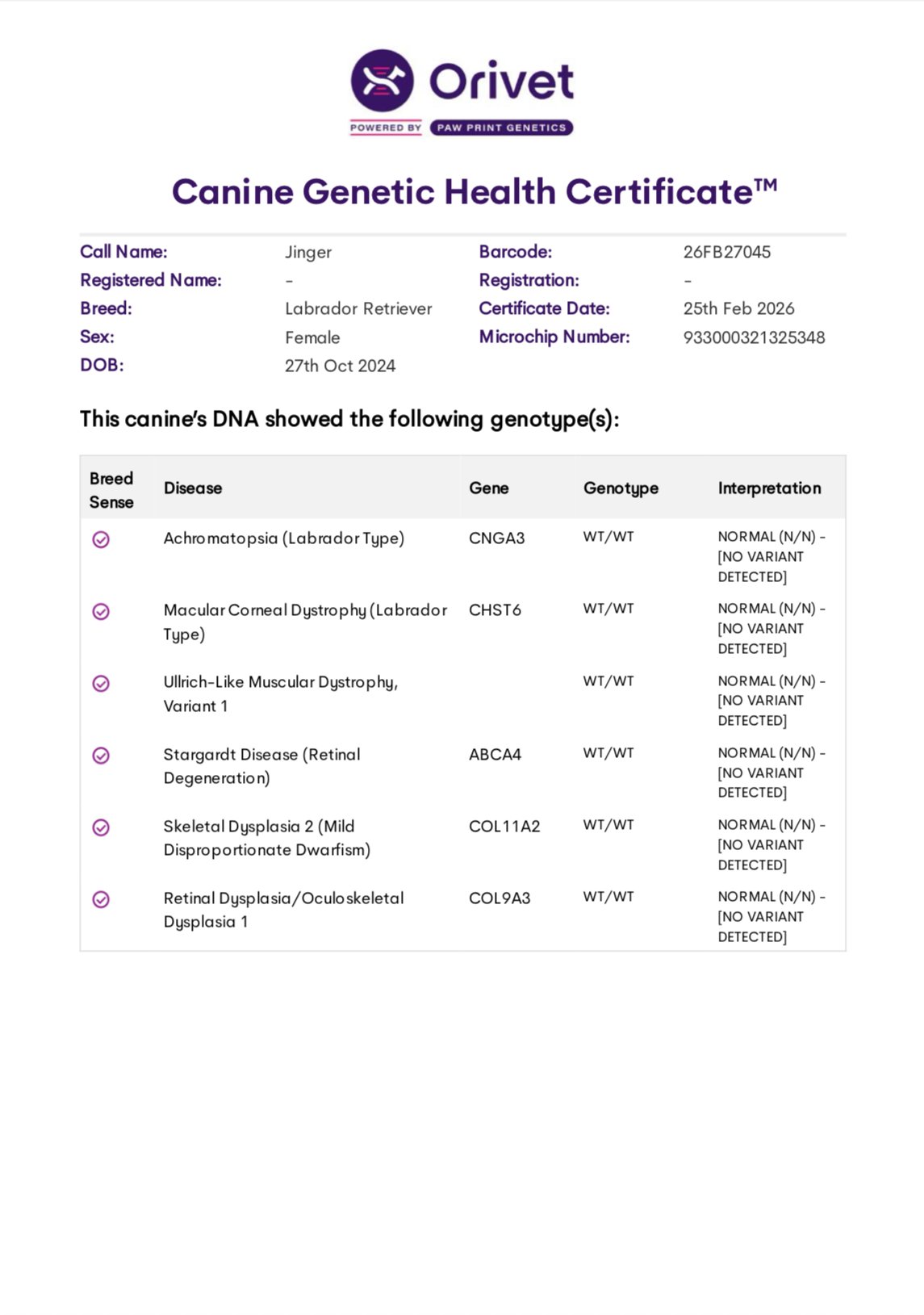 Lula is clear for PRA, CM, DM, EIC, HNPK, and Skeletal Dysplasia, and is Dilute Free. OFA Hips, Elbows Normal, OFA Eye (CAER) Exam Normal.