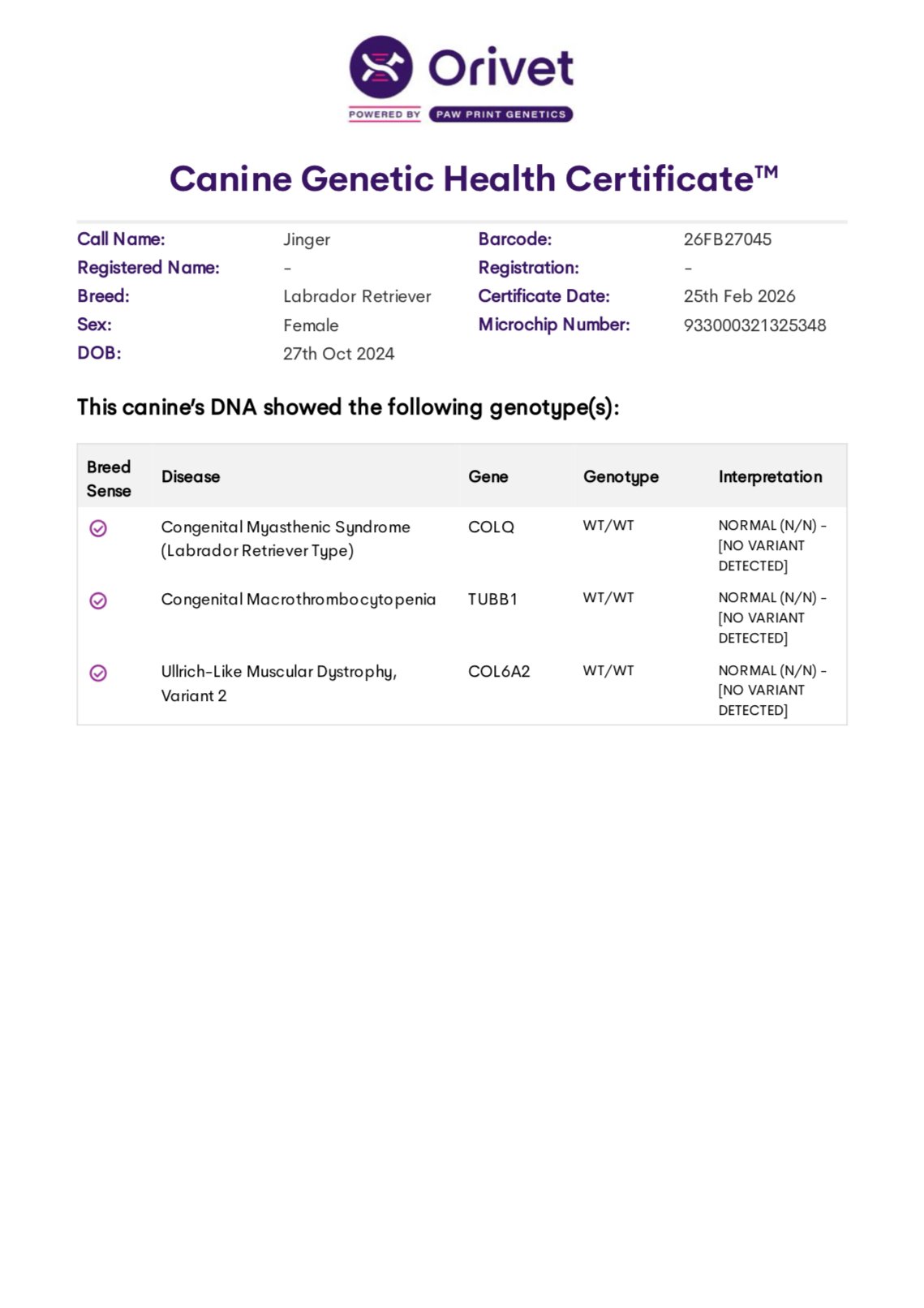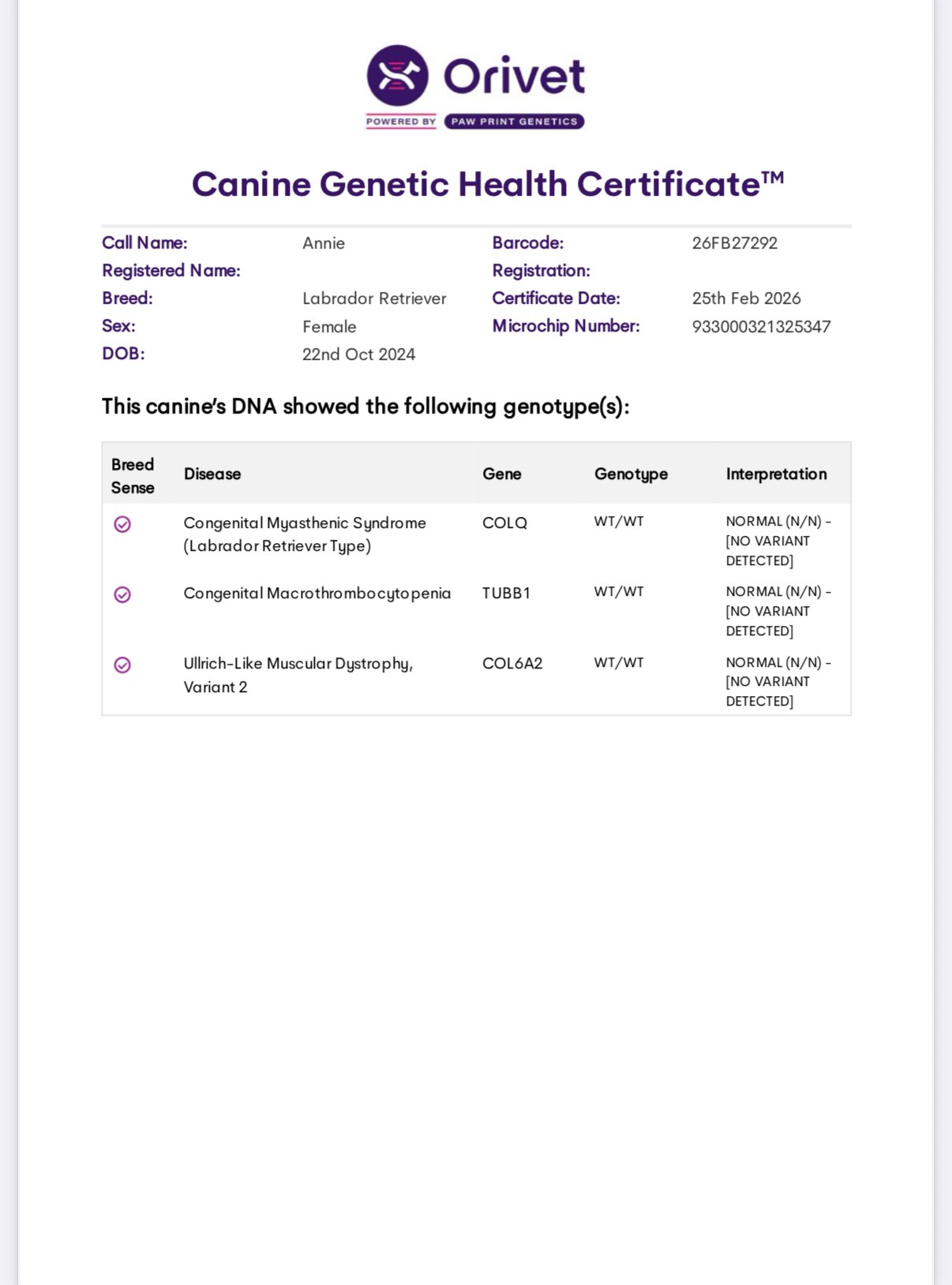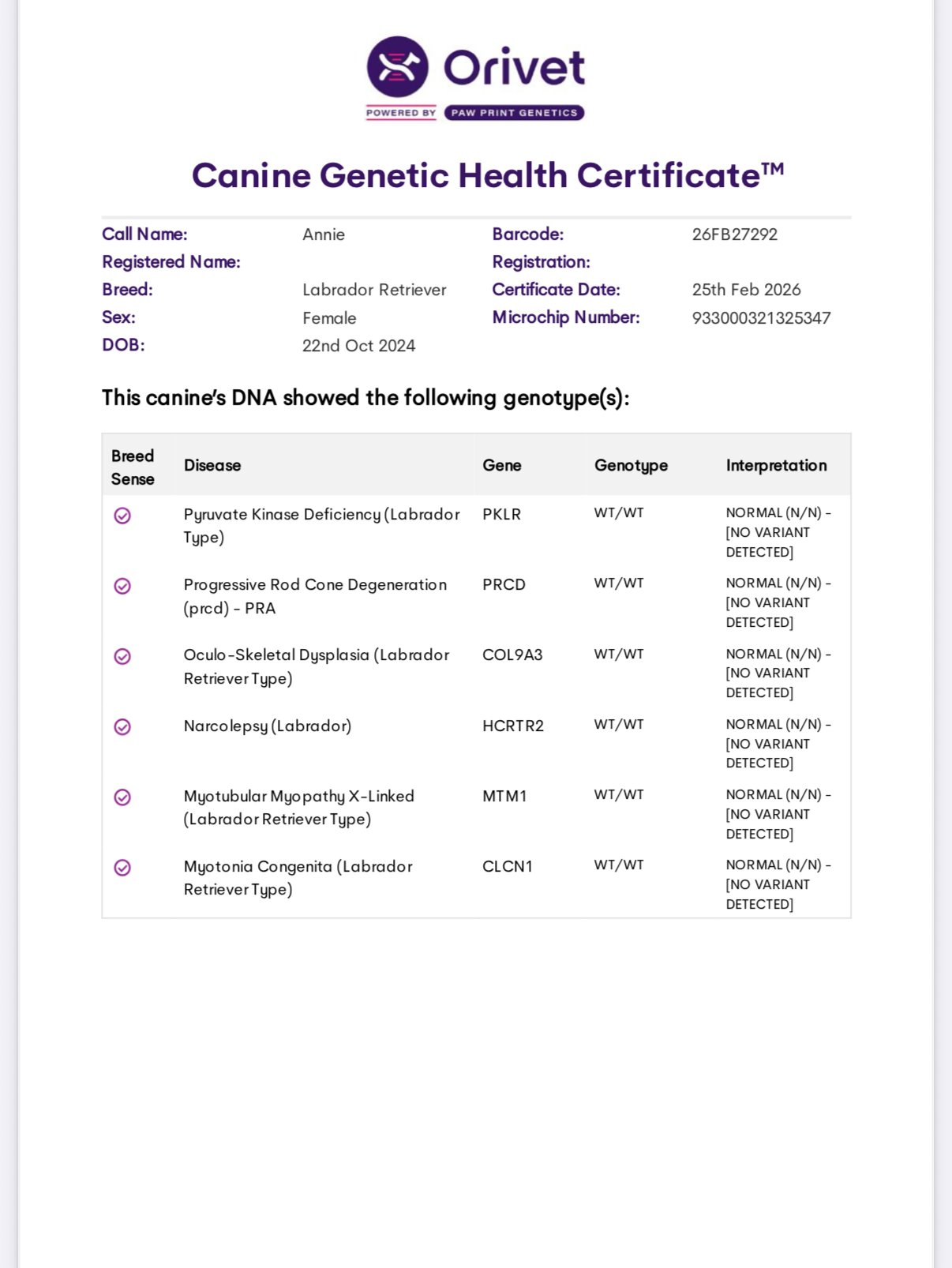 She has been DNA tested and is clear for EIC, PRA, CNM, DM, HNPK, and is a carrier for MCD. OFA Hips Good. Elbows Normal, OFA Eye (CAER) Exam Normal.