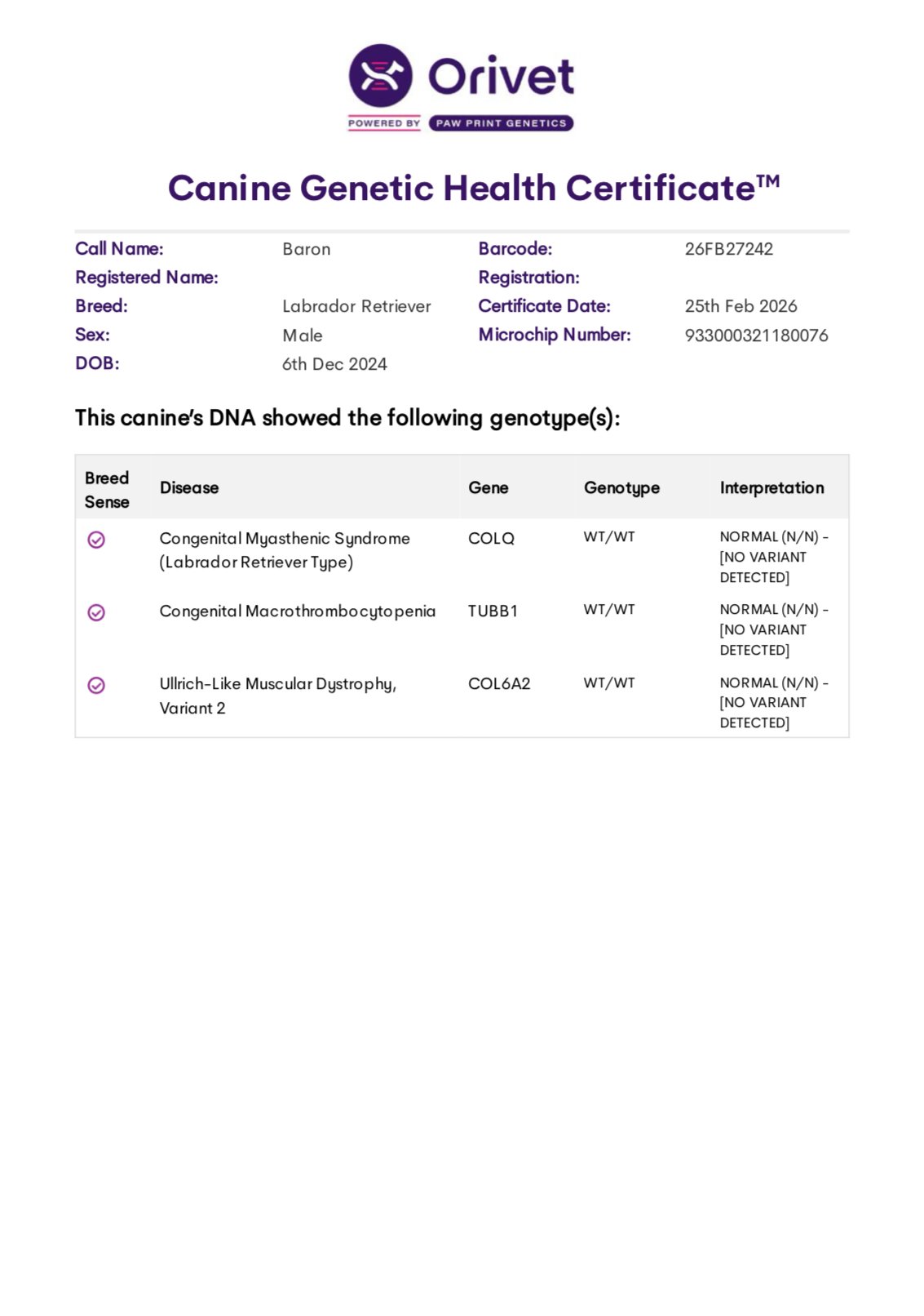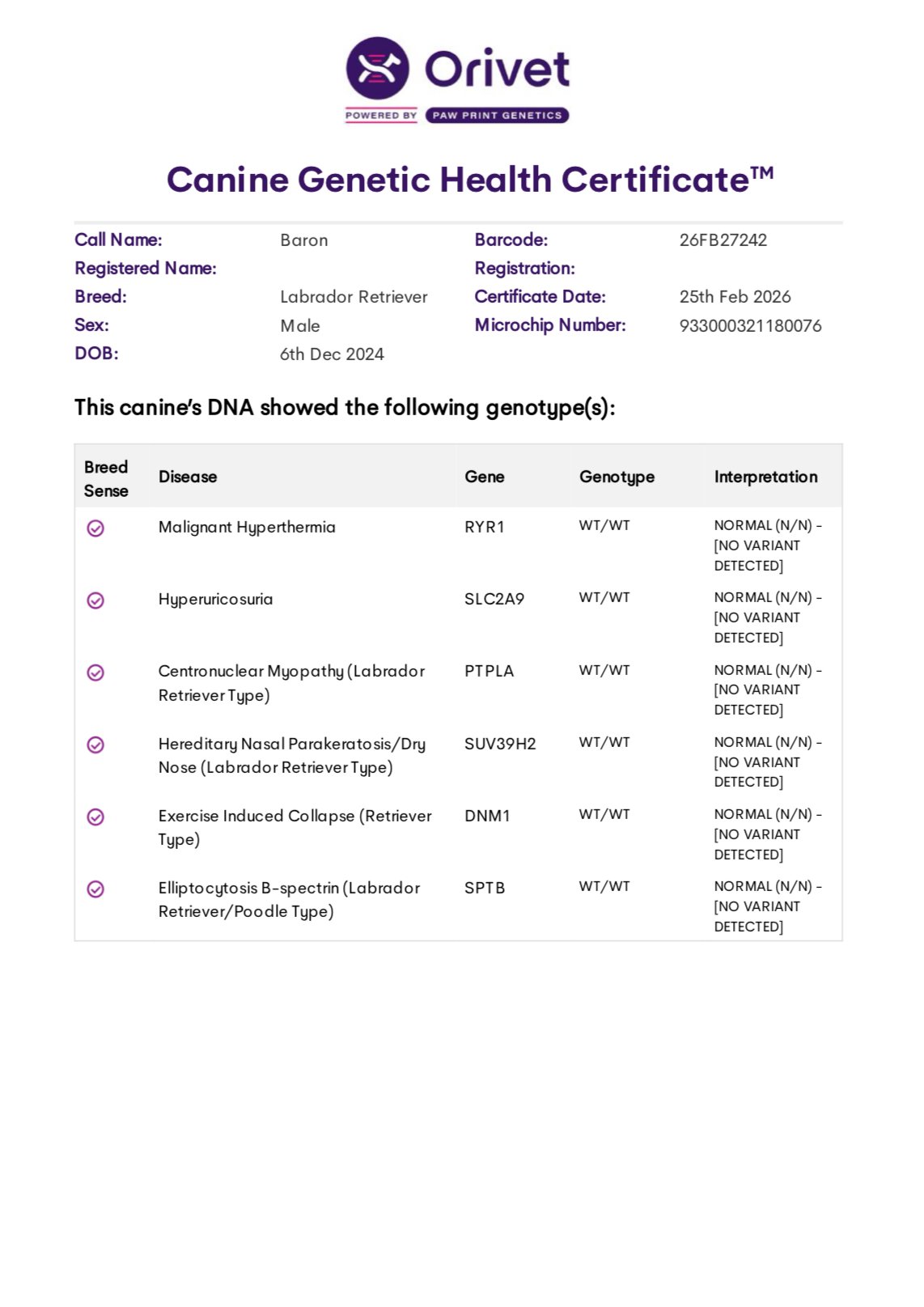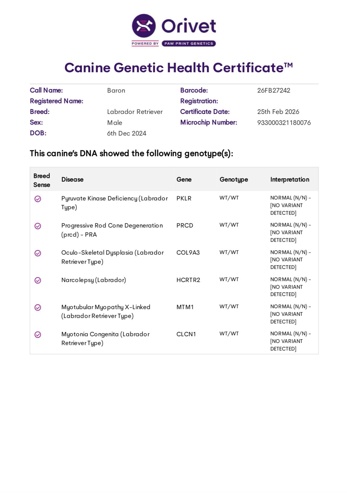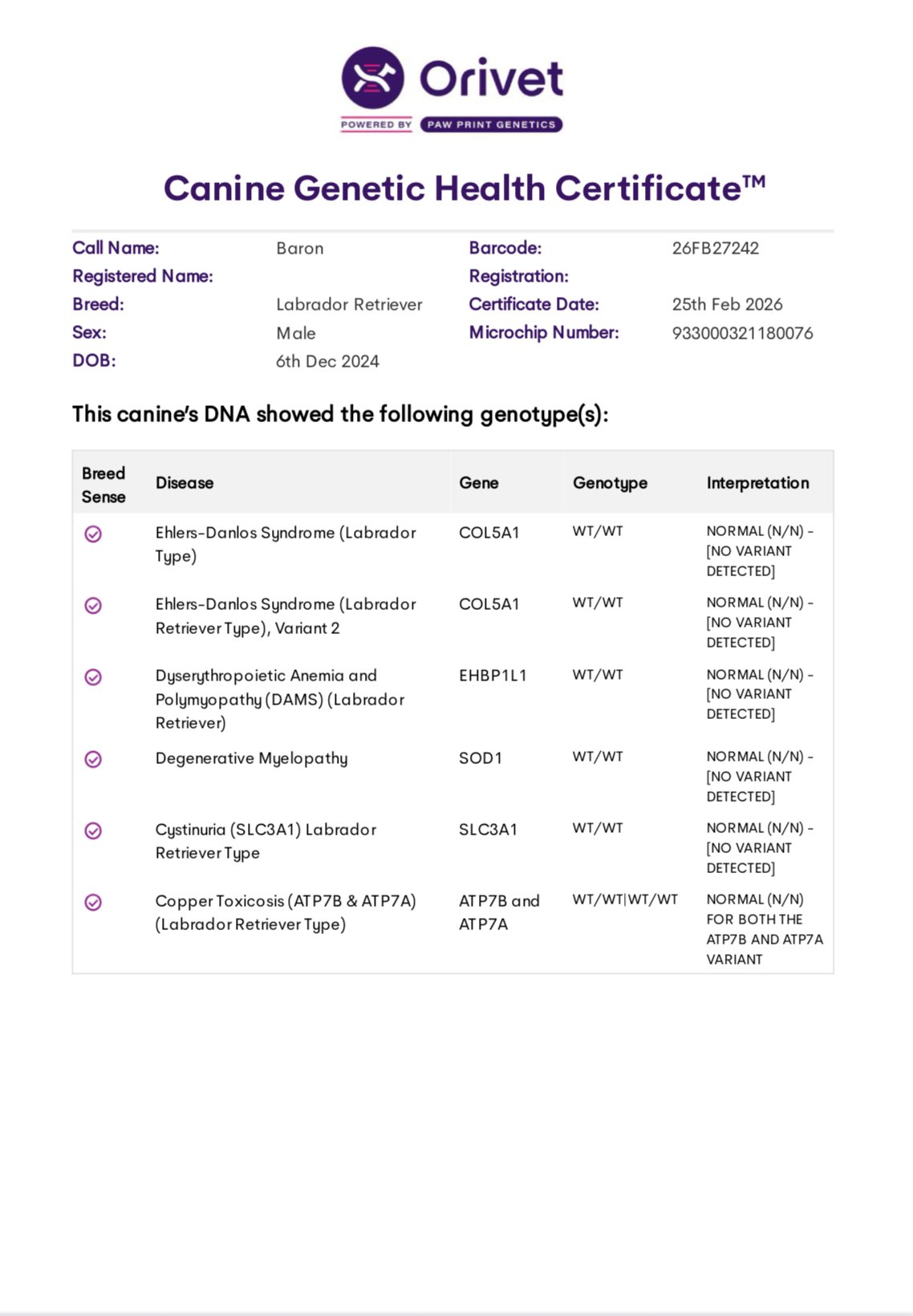 He’s been tested through Embark and is clear for all, including CM, DM, EIC, HNPK, PRA, and Skeletal Dysplasia. OFA Hips- Excellent, Elbows Normal.